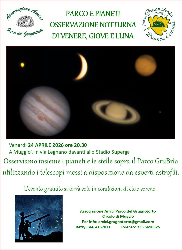 Venerdì 24 aprile alle ore 20.30 l'Associazione amici Parco del Grugnotorto propone l'osservazione guidata del cielo notturno e dei pianeti utilizzando telescopi messi a disposizione da esperti astrofili.