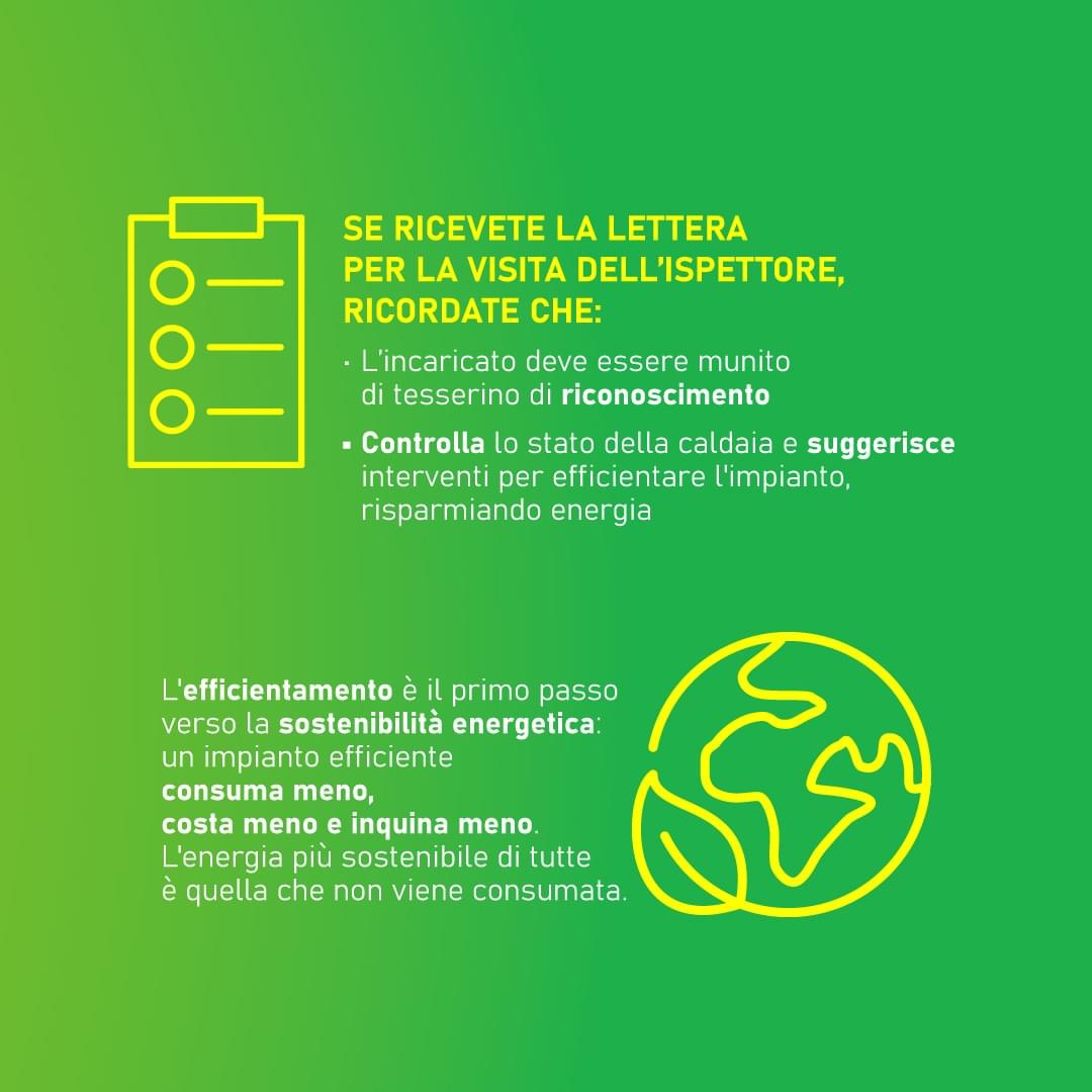 A tutte le cittadine e cittadini può arrivare una lettera che preannuncia la visita dell'ispettore, incaricato da Città metropolitana e munito di tesserino di riconoscimento che, oltre a controllare che l'impianto abbia ricevuto regolare manutenzione, consiglia interventi per efficientare l'impianto e quindi risparmiare energia.
