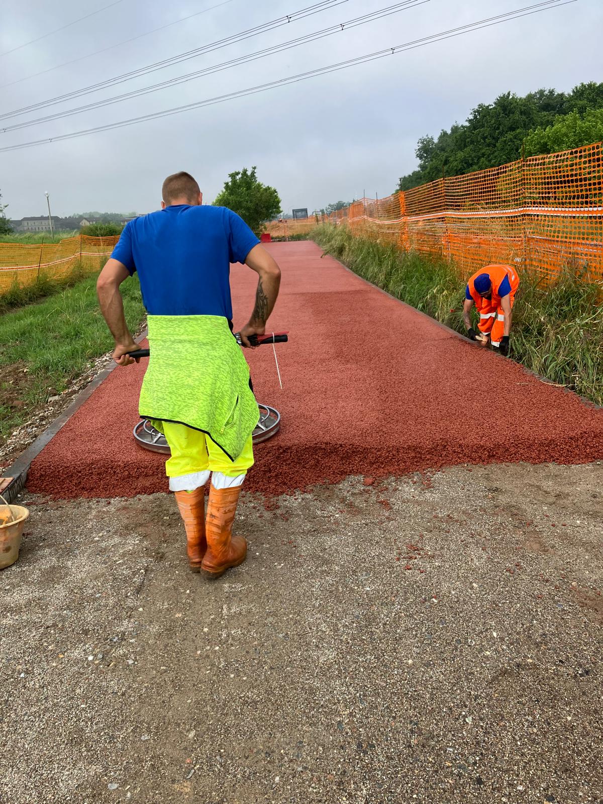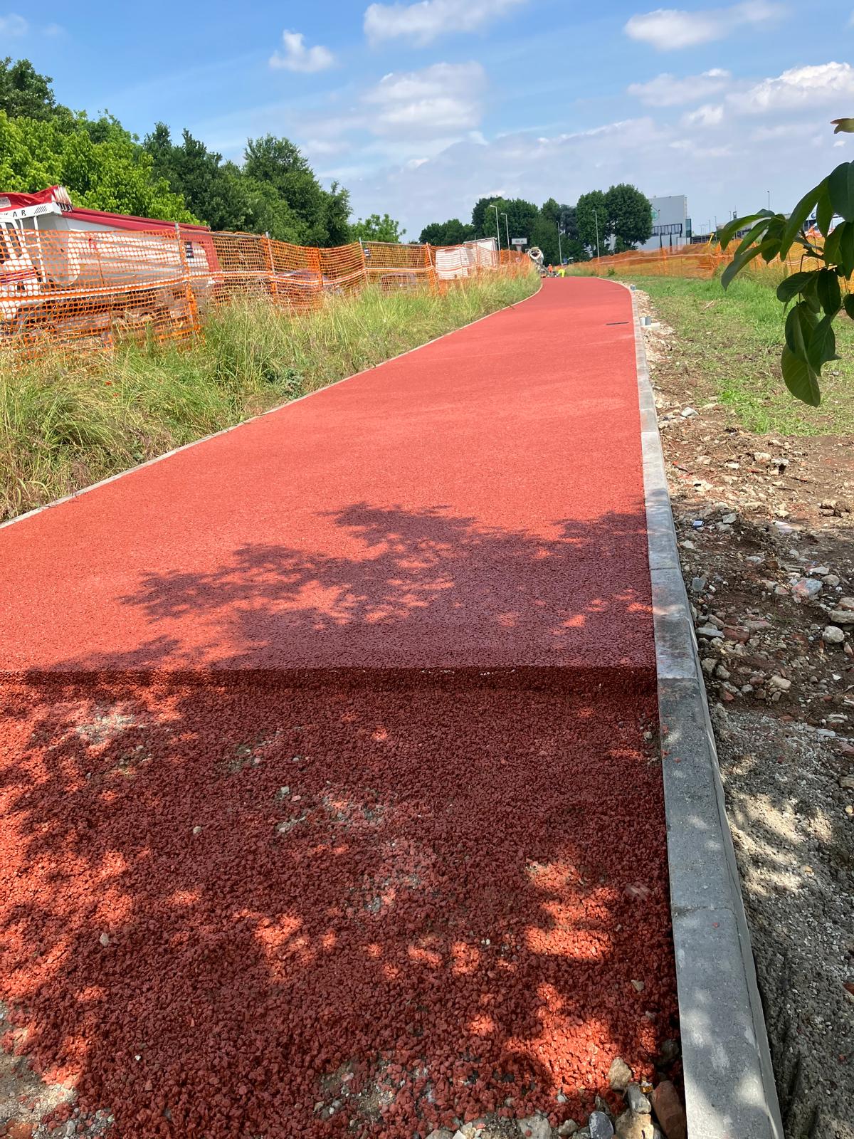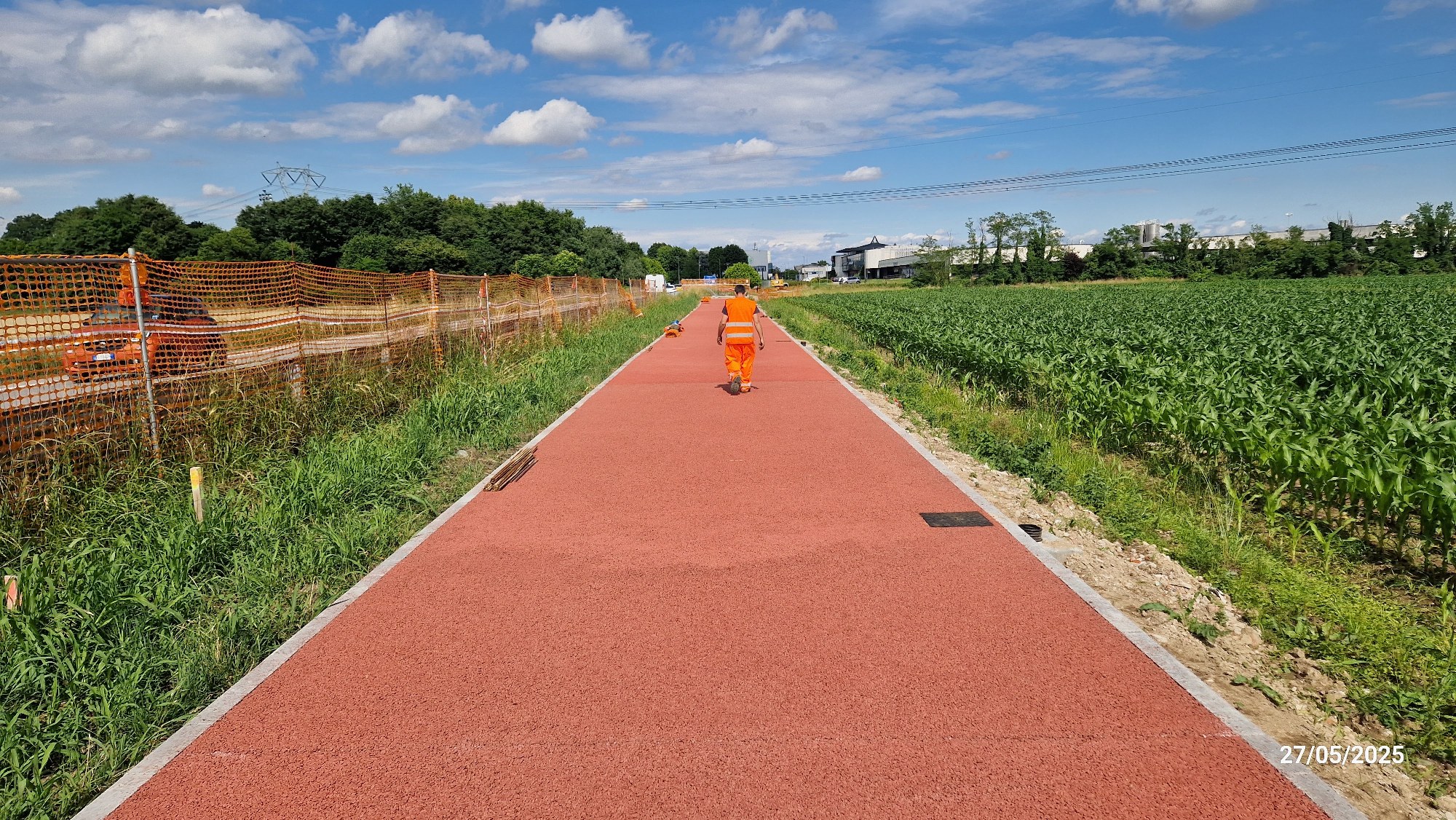 Proseguono i lavori sulla linea 12 di Cambio. Il 22 maggio sono iniziati i lavori di pavimentazione con calcestruzzo drenante della pista ciclabile Biciplan Cambio Linea 12 in fase di costruzione dalla rotatoria SP114 - viale Europa in Comune di Cusago in direzione Abbiategrasso.