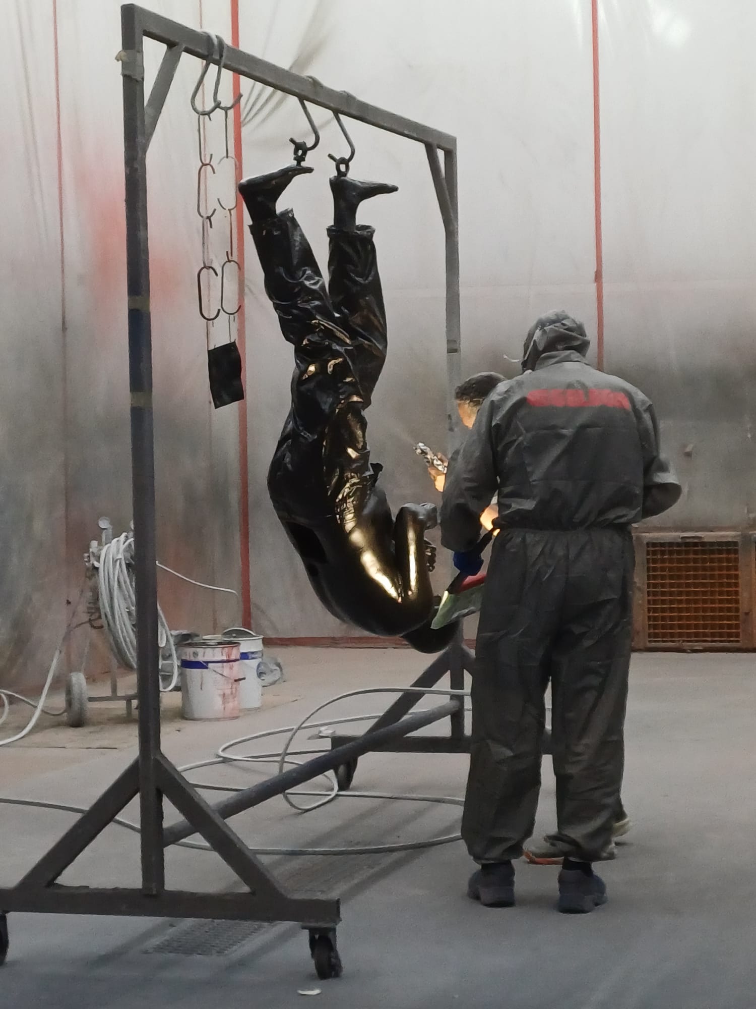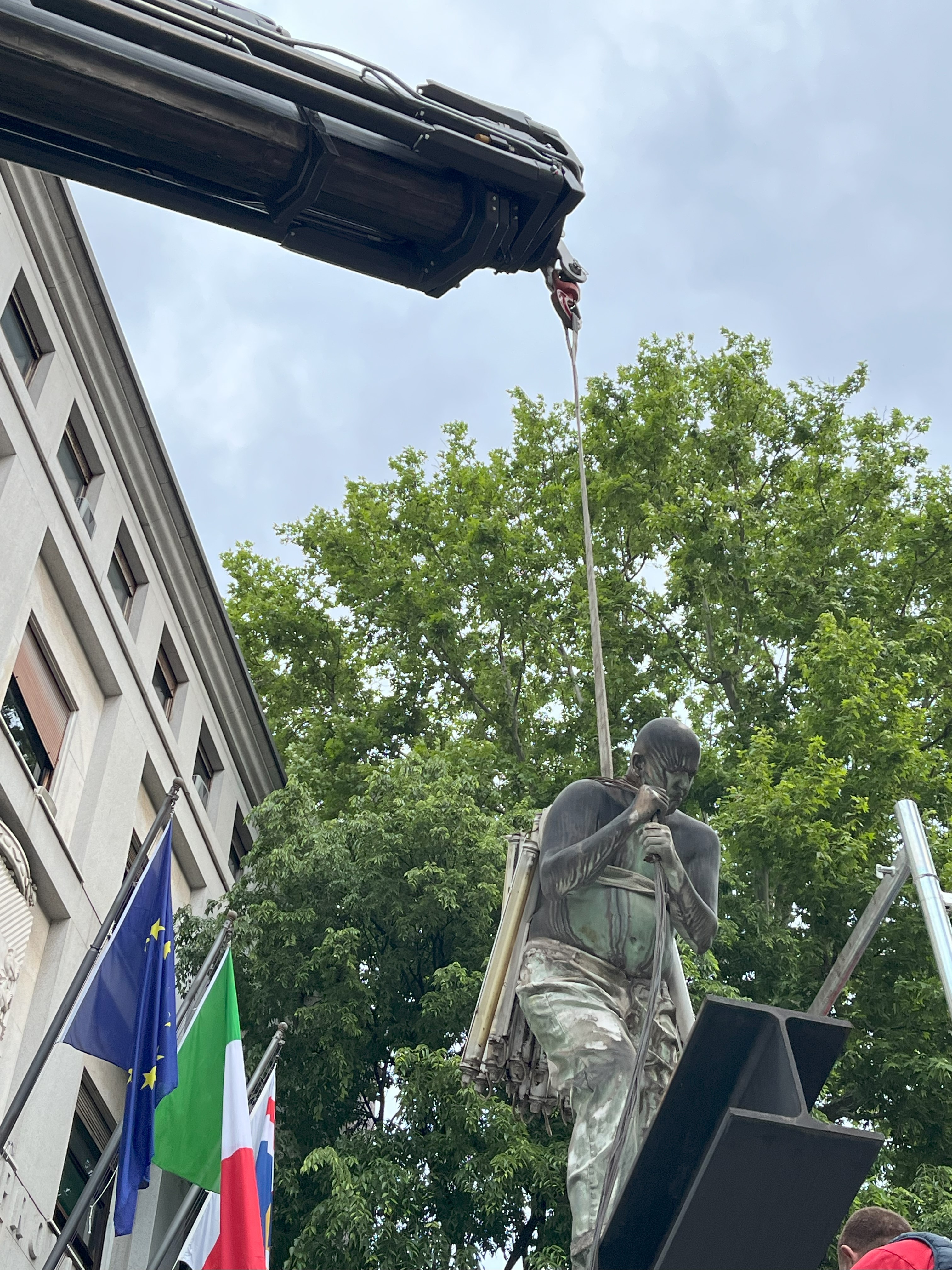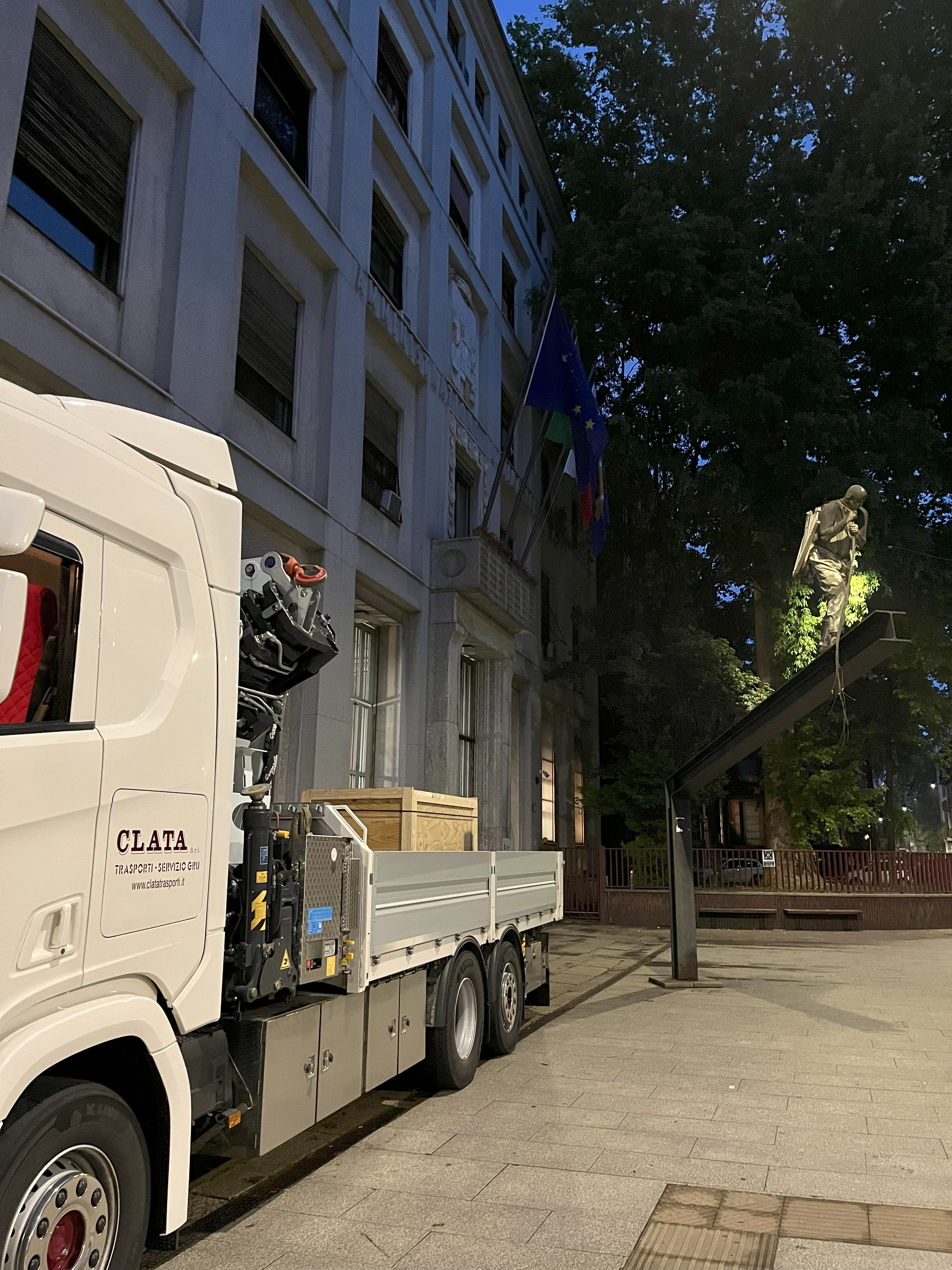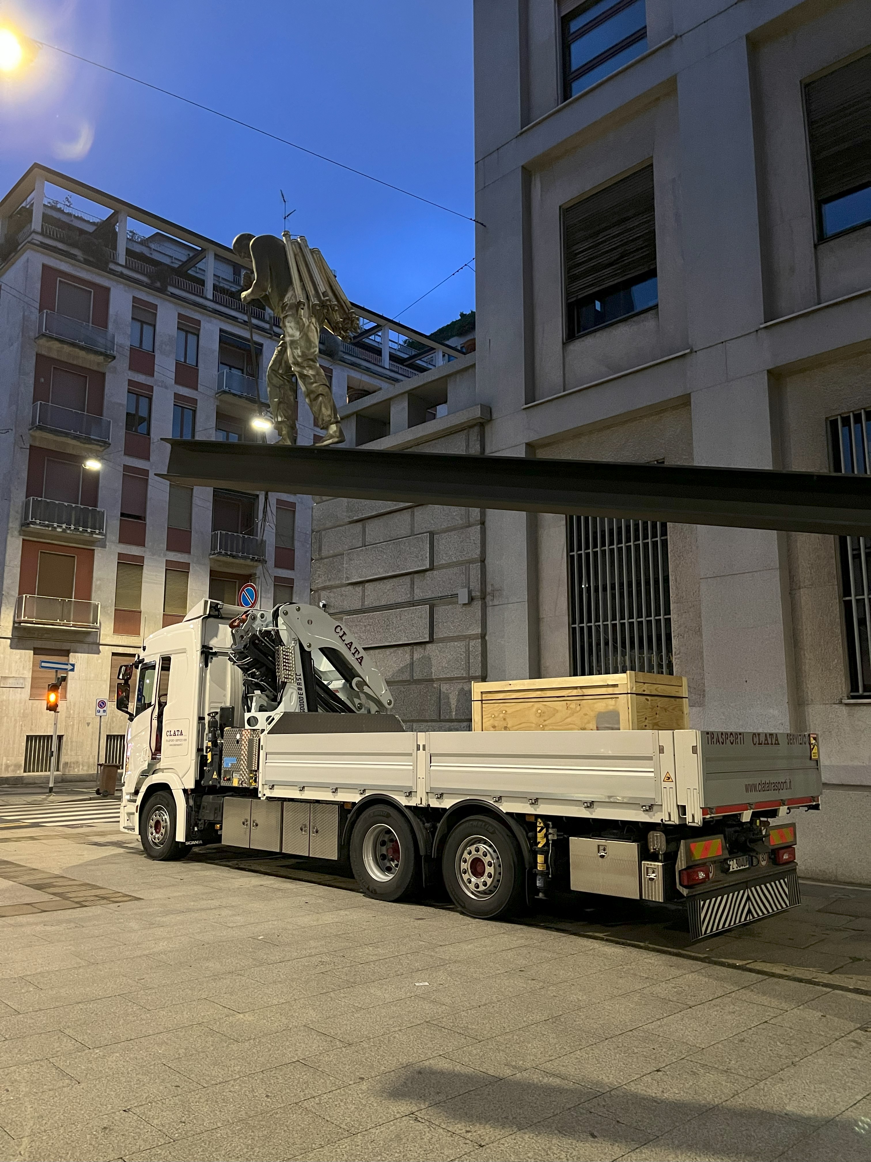 All'alba di lunedì 5 maggio la scultura"L'Umo della luce" è stata sganciata dal suo supporto davanti alla sede della Città metropolitana di Milano per iniziare un percorso di restauro in laboratorio.