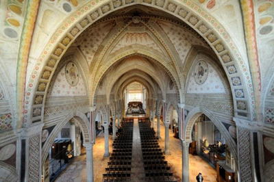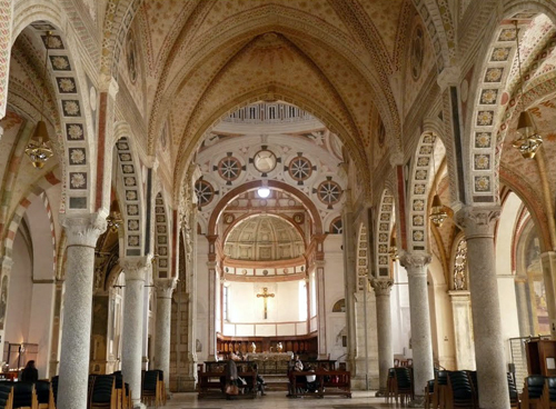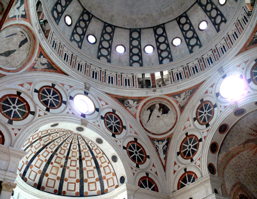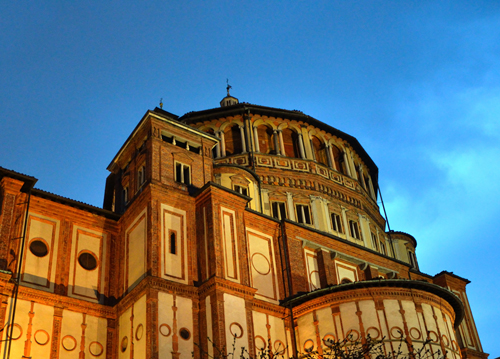 Un gruppo di Domenicani, che aveva aderito - contrariamente a quelli di Sant'Eustorgio - alla riforma dell'Ordine ("Regolare Osservanza") ottennero dal cortigiano sforzesco Gaspare Vimercati un terreno a Porta Vercellina. I lavori per l'edificazione della chiesa e di una prima parte del convento, su progetto attribuito senza prove a Guiniforte Solari, iniziarono intorno al 1463 e furono terminati del tutto nel 1487. L'impronta solariana, ancora legata alla tradizione tardogotica, è riconoscibile negli archi acuti, nelle crociere ogivali e negli affreschi decorati a motivi geometrici delle tre navate, nel chiostro dei morti, nel refettorio e nella biblioteca (oggi perduta). Caso insolito, della chiesa domenicana appena terminata fu deciso subito un rinnovamento, dapprima con i tondi prospettici con figure di santi dell'Ordine (attribuiti al Butinone e allo Zenale) poi, intorno al 1489, aggiungendo alla facciata un portale o protiro di marmo, di forme classiche, dove eleganti colonne su piedestallo reggono una trabeazione e una volta a botte cassettonata. D'autore ignoto, il portale già attribuito a Gian Cristoforo Romano e all'Amadeo presenta motivi decorativi ricorrenti in Lombardia alla fine del XV secolo e con assonanze bramantesche (come le candelabre sulle lesene e i tondi nel fregio). Ma fu per diretta volontà di Ludovico il Moro assecondato dal priore Vincenzo Bandello, intellettuale e teologo, che si avviò un rinnovamento stilistico e un "aggiornamento " al nuovo gusto, per i quali è probabile che ci si avvalesse del più autorevole tra gli ingegneri ducali, Donato Bramante. Anche se manca un documento esauriente riguardo a un suo incarico per la progettazione e ci si deve accontentare di testimonianze indirette o più tarde (Bruschi, '69 p. 194 e 784; Patetta '87, p.168; Borsi '89, p.211) pochi hanno dubbi sul riconoscere come bramantesca l'intera tribuna delle Grazie. Essa dovette impressionare (e colpisce ancor oggi) per il radicale distacco come concezione, come proporzioni e dimensione, come riferimenti storici e simbolici, dalla preesistente parte solariana, della quale sostituì il coro e le due cappelle che lo fiancheggiavano. Bramante impostò una grande pianta centrica, una tricora il cui corpo centrale, un quadrato di 20 metri di lato, era pari all'insieme delle tre navate ogivali. Il vano cubico è sormontato da una cupola semisferica su alto tamburo. Pur debitrice verso la Sagrestia Vecchia di Brunelleschi (1428 c.) la tribuna delle Grazie terminata nel 1498 presentava un inedito repertorio formale (le finestre nel tamburo, i dischi "rotanti", la citazione del poliedro di fra' Luca Pacioli nelle nicchie) e di presenza simbolica dei numeri (16 oculi nella cupola, 12 dischi negli arconi sotto la cupola, 12 oculi e 12 piccoli tondi in 8 spicchi della volta del coro, 4 tondi nei pennacchi ecc. I numeri si riferivano agli Evangelisti e agli Apostoli, mentre l'otto era il numero dedicato alla Madonna). In molti dettagli sono presenti caratteri dello sperimentalismo bramantesco, come le lesene senza base all'interno del tamburo, i rapporti accentuati in altezza nelle lesene degli arconi sotto la cupola, le stesse lesene piegate in dimensione doppia al di là del vano centrale verso il coro ecc., nonché compaiono sottili correzioni ottiche: il vano non perfettamente quadrato bensì allungato verso il fondo, l'abside alla conclusione del coro più stretta delle altre, le finestre del coro aperte non in mezzarìa delle pareti ma spinte un po' verso il fondo. E' possibile che nel 1497, alla morte per parto della giovane moglie Beatrice d'Este, il Moro intendesse fare della tribuna il mausoleo sforzesco collocandovi il monumento funerario suo e di Beatrice, opera di Cristoforo Solari (oggi alla Certosa di Pavia). Nello stesso anno 1497 il Moro manifestava anche l'intenzione di proseguire nel rinnovamento della chiesa oltre la tribuna già in gran parte edificata. Infatti, ordinava di consultare i maggiori esperti d'architettura "per fare uno modello per la fazada...havendo respecto a l'altezza in la quale se ha ad ridurre la ecclesia proportionata alla Cappella grande " (Patetta, '87, p.165). Esternamente l'opera di Bramante presenta un tiburio poligonale a sedici lati e una decorazione in mattoni e terracotte un po' epidermica e più marcatamente di tradizione lombarda. E' dell' Amadeo la sommità del tiburio, con le 64 colonnine di marmi di vari colori a formare le 32 bifore del loggiato. Il nome di Bramante è stato fatto, ma con minore convinzione, anche per l'elegante chiostro piccolo e per la Sagrestia, dove nelle decorazioni della volta si possono trovare riferimenti anche a Leonardo, d'altronde presente nel refettorio per il Cenacolo terminato nel 1498 e autore sia di uno schizzo per lo schema della tribuna, sia di alcuni studi sugli "archi delle grazie " e su una volta " a ombrello" in tutto simile a quella realizzata nel coro.