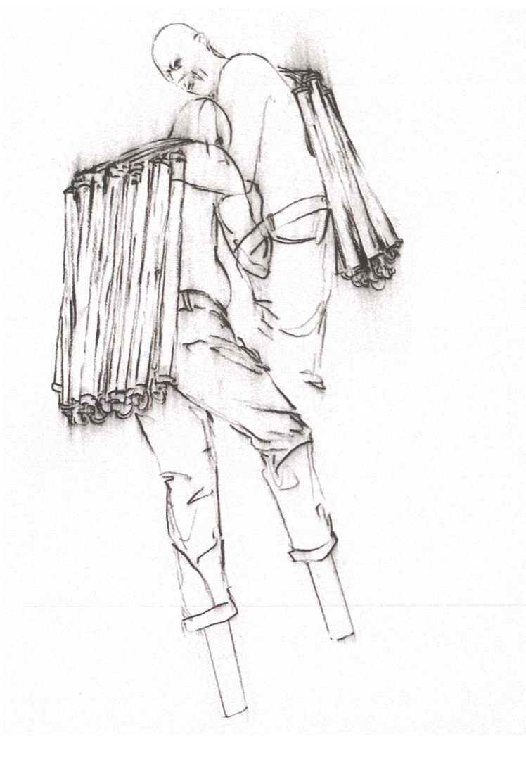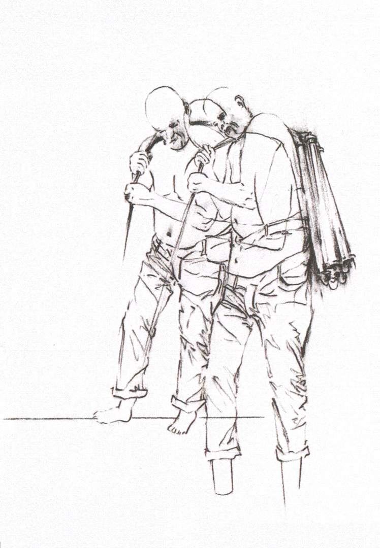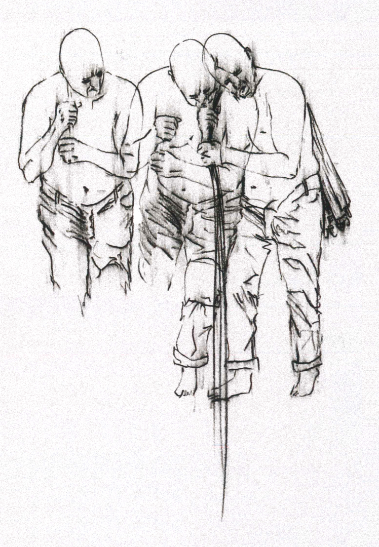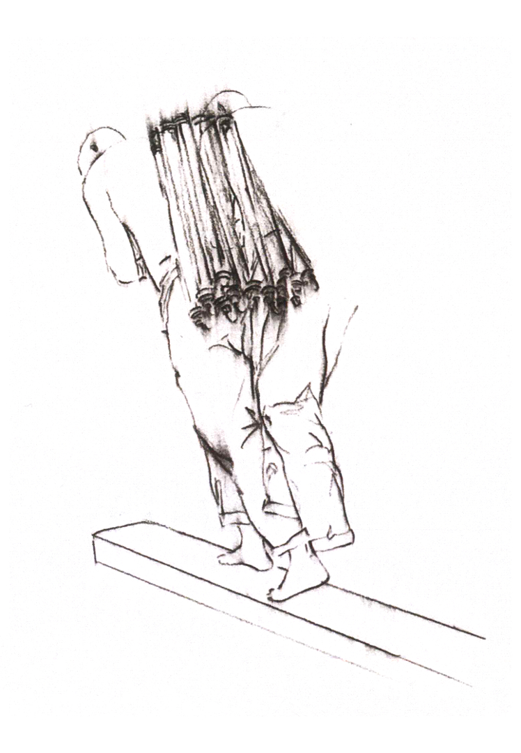 Una figura umana imponente – copia di un modello reale – arranca su un asse di ferro inclinata. L’uomo porta sulle spalle un fascio di luci al neon, che tuttavia non illumina il suo cammino: egli avanza nell’incertezza del buio. Realizzata in bronzo patinato ad acido bianco, l’opera è concepita per restare con le luci accese tutto l’anno, fatta eccezione per il 9 maggio, Giornata nazionale dedicata alle vittime del terrorismo.