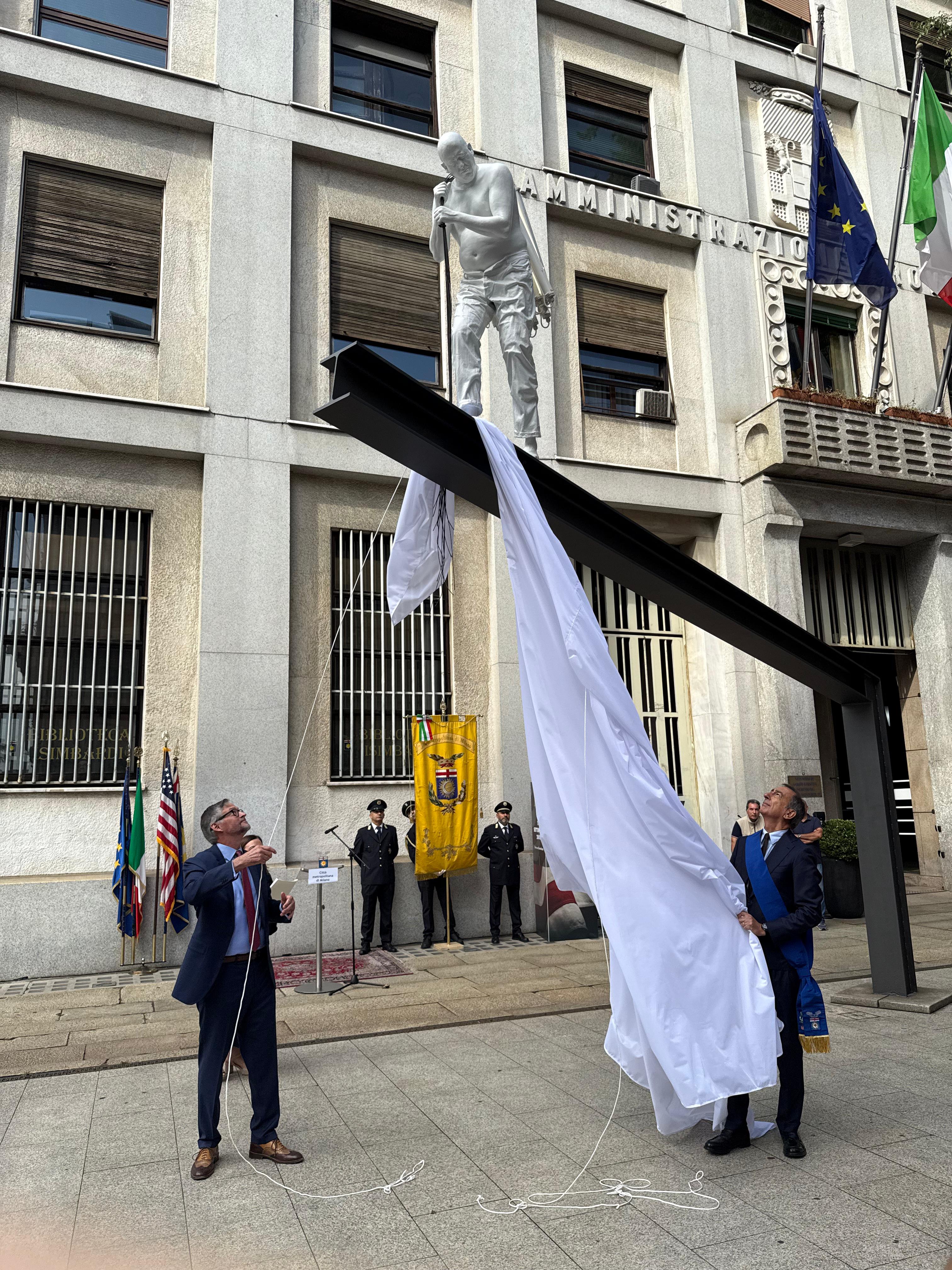 All'alba di lunedì 5 maggio la scultura"L'Umo della luce" è stata sganciata dal suo supporto davanti alla sede della Città metropolitana di Milano per iniziare un percorso di restauro in laboratorio.