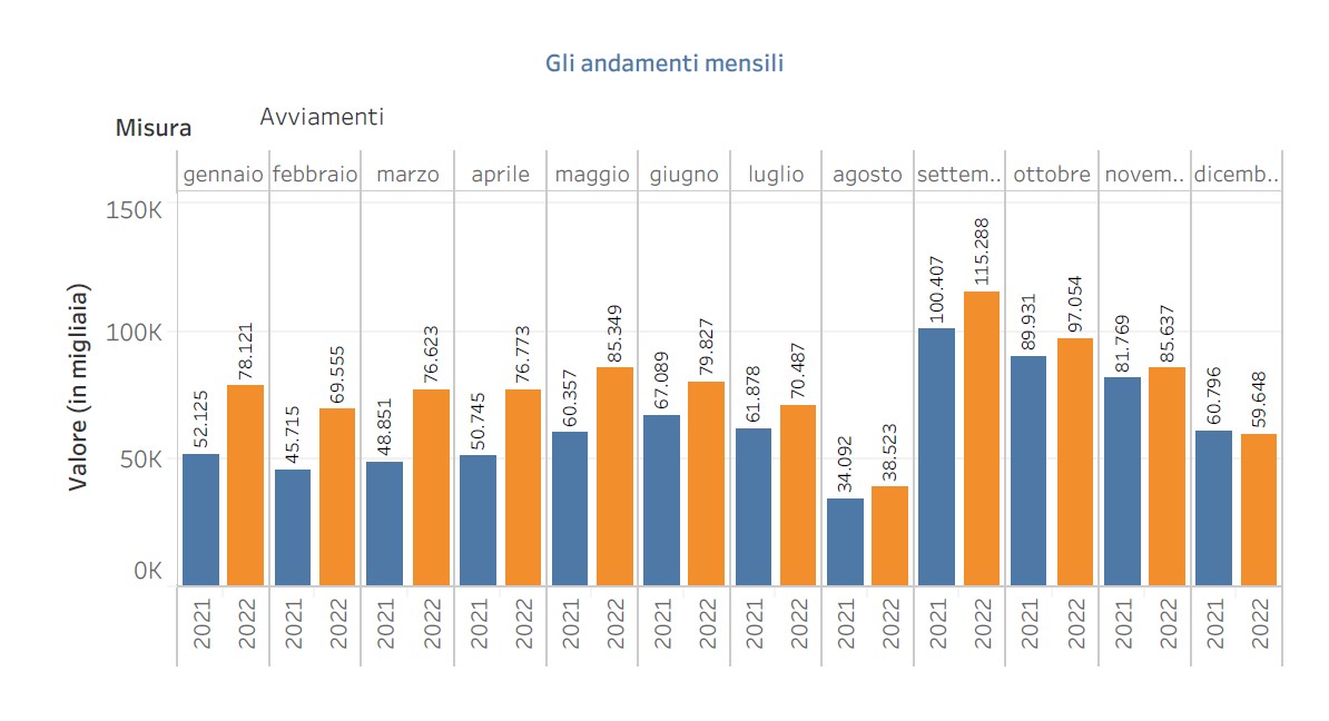 Il trend di recupero rispetto al 2021 – secondo terribile anno di pandemia, quantunque rischiarato dall’arrivo dei vaccini – è evidente nella tabella dei dati di sintesi, ma ancor più nel grafico dell'andamento degli avviamenti mese per mese che riportiamo qui sotto.