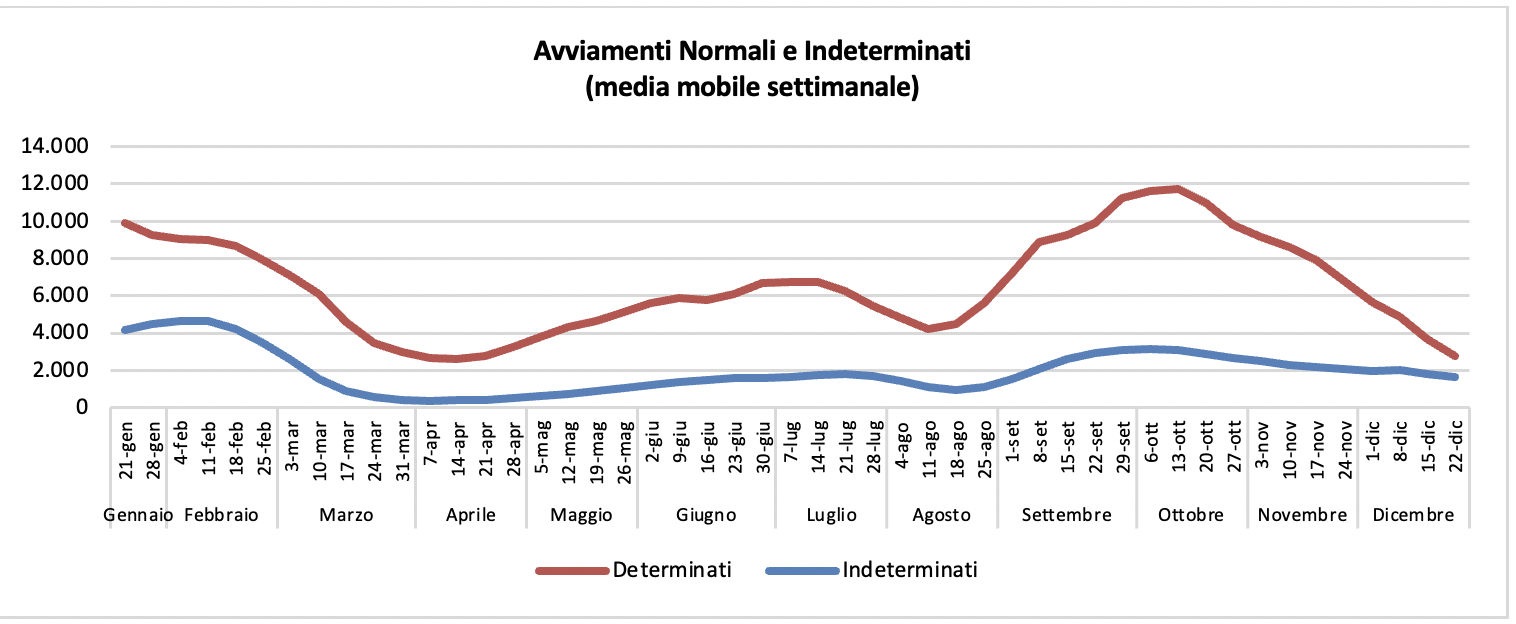 Nella settimana dell’11 febbraio si è registrato il picco annuale di nuovi avviamenti a tempo indeterminato. Nel prosieguo dell’anno il trend di questa forma contrattuale rimane, sebbene su livelli inferiori a gennaio, in sostanziale stabilità. Il secondo semestre parte in maniera molto positiva per i contratti a tempo indeterminato fino a raggiunge ad ottobre una media di tremila trecento avviamenti alla settimana, valore che non si discosta molto da quello registrato ad inizio anno.