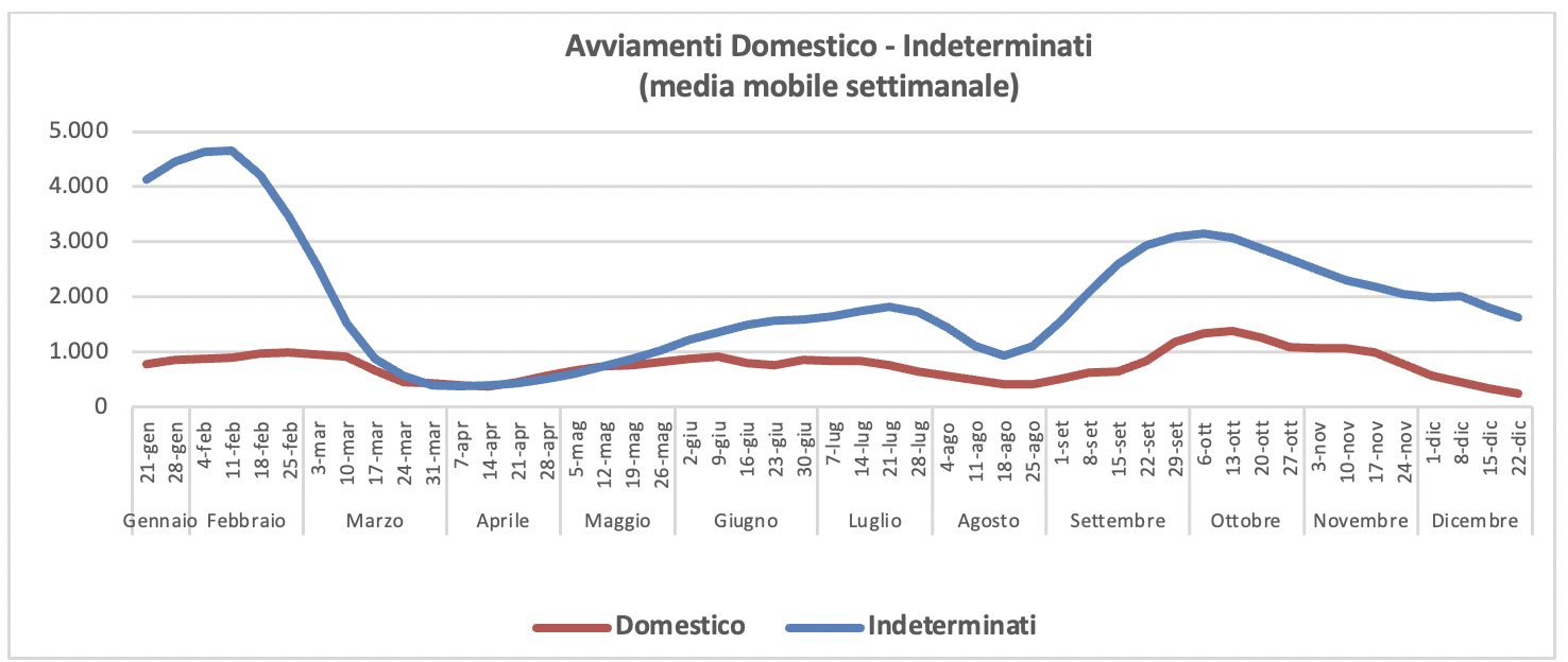 Secondo elemento evidenziato dalla Figura 14 riguarda la tenuta di questi rapporti di lavoro anche nelle settimane di lockdown quando addirittura il numero degli avviamenti domestici supera quello degli avviamenti a tempo indeterminato; evento mai registrato in precedenza.