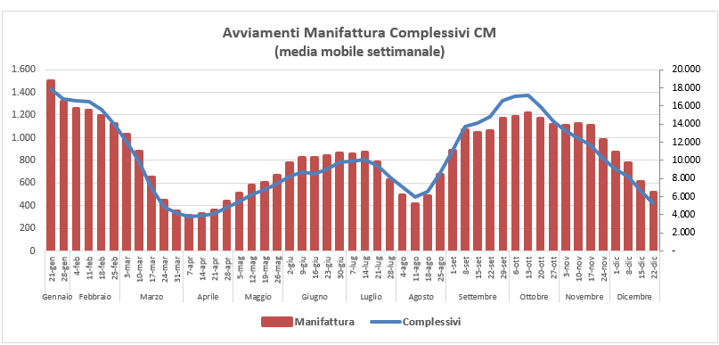 Nei primi mesi del 2020, il trend degli avviamenti settimanali del complesso del comparto manifatturiero ha ricalcato quello generale del mercato del lavoro milanese, per poi differenziarsi da maggio in avanti mostrando segnali di ripresa più vigorosi, mantenuti per tutto il resto dell’anno.