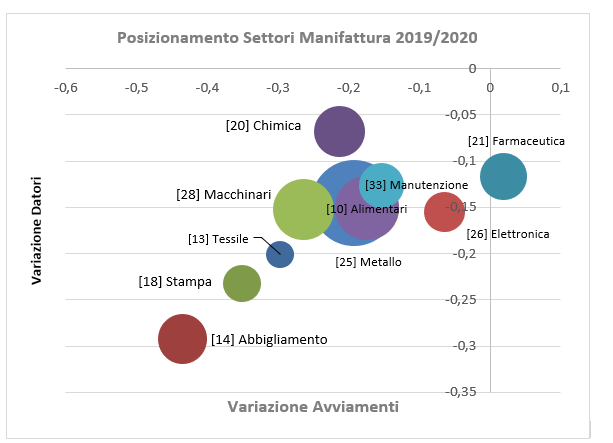La Figura 17, in analogia alla Figura 15, presenta il differente impatto della crisi esclusivamente per i settori manifatturieri: dove la chimica e la farmaceutica hanno sostanzialmente retto, mentre i settori dell’abbigliamento e del tessile sono stati i più penalizzati sia in termini di avviamenti al lavoro sia nel numero di datori di lavoro che li hanno comunicati. Si ricorda che la dimensione della bolla rappresenta il numero di lavoratori avviati nel settore.