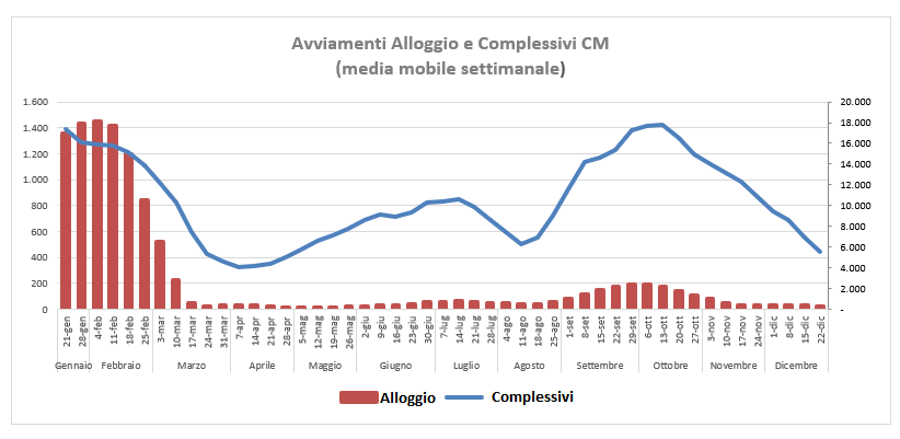 La Figura 20 che riporta l’andamento settimanale delle comunicazioni di avviamento conferma visivamente i valori evidenziati per l’intero anno, ma consente di mostrare quanto il settore fosse in “salute” prima che sopraggiungesse la pandemia. Infatti, nelle prime settimane del 2020 gli avviamenti nel settore si presentavano in crescita, forse anche in virtù del successo della settimana della moda milanese. In seguito tutte le strutture ricettive si sono fermate e non si sono più riprese; anche i tentativi, timidi e di breve durata, di ripartenza a settembre hanno mosso meno di 200 avviamenti alla settimana, rispetto ai valori medi pre pandemia superiori a 1.300 avviamenti alla settimana.