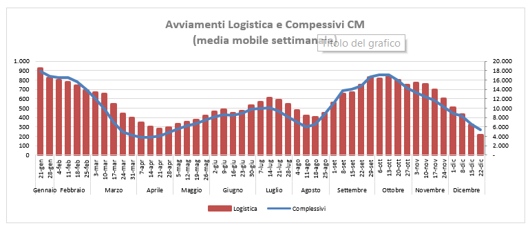 La Figura 23 presenta visivamente quanto la logistica abbia superato tutte le fasi della crisi, rimanendo attiva anche nei periodi di calo per il resto del mercato del lavoro, mantenendo costante il proprio trend anche verso la fine dell’anno quando il mercato del lavoro complessivo è calato nuovamente.