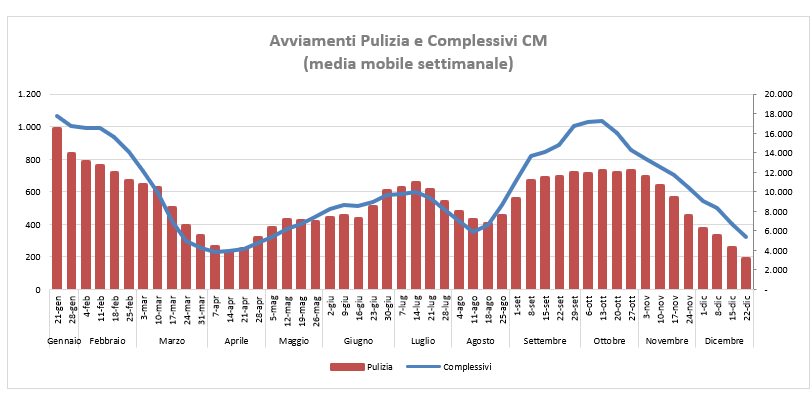 Questo settore produttivo non appare beneficiare della ripresa delle attività dopo il primo lockdown nella stessa misura del resto del mercato del lavoro, ulteriormente, nei mesi di settembre ed ottobre il numero degli avviamenti nelle “pulizie”, contrariamente al complesso del mercato del lavoro che appariva ripartire, è rimasto stabile segno che il perdurare, sul lungo periodo, del ricorso allo smart working negli uffici possa essere un rischio il futuro di questo comparto produttivo.