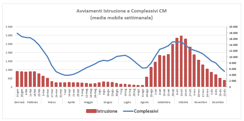 Si è scelto di chiudere la carrellata degli andamenti dei singoli settori produttivi con l’esposizione del settore dell’Istruzione [Ateco 85] poiché questo settore segue da sempre dinamiche proprie, avulse da elementi di congiuntura economica; ciò si è confermato anche quest’anno nonostante sia stato così profondamente perturbato dalla diffusione della pandemia. Il settore dell’istruzione è, infatti, l’unico che è rimasto imperturbato dalla diffusione del virus, seguendo piuttosto la dinamica tradizionale delle assunzioni dei docenti precari annuali, che genera grandi volumi di avviamenti concentrati nei mesi di settembre ed ottobre con le relative cessazioni per termine del contratto a fine giugno. In valori assoluti i lavoratori avviati almeno una volta nel settore nel corso del 2019 sono stati 25.275, l’anno successivo 25.906 segnando addirittura una crescita del 2,5% (pesando, nel 2020, per l’8,5% degli avviati complessivi).