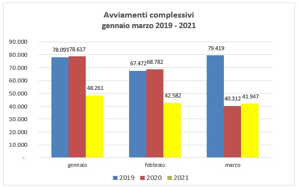 La Figura 43 presenta i più recenti dati disponibili [9] relativi degli avviamenti mettendo a confronto i prime tre mesi del 2020 con il 2021. Di questi tre mesi, tuttavia, solo il mese di marzo 2021 è comparabile con mese di marzo 2020 poiché gennaio e febbraio 2020 non sono stati interessati dalle restrizioni covid-19.