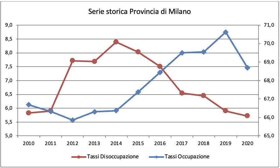 Gli indicatori registrati dalla indagine campionaria delle “forze lavoro”, rilevazione continua effettuata dall'ISTAT riguardo alla condizione occupazionale della popolazione residente, consentono di inquadrare l'evoluzione di lungo periodo dell'occupazione nel territorio milanese, fotografando annualmente gli stock[1] delle persone occupate e di quelle in cerca di occupazione nel territorio metropolitano. La continuità della rilevazione con misure comparabili nel tempo permette di fissare con accuratezza la condizione dell’occupazione anche in un lungo arco temporale.