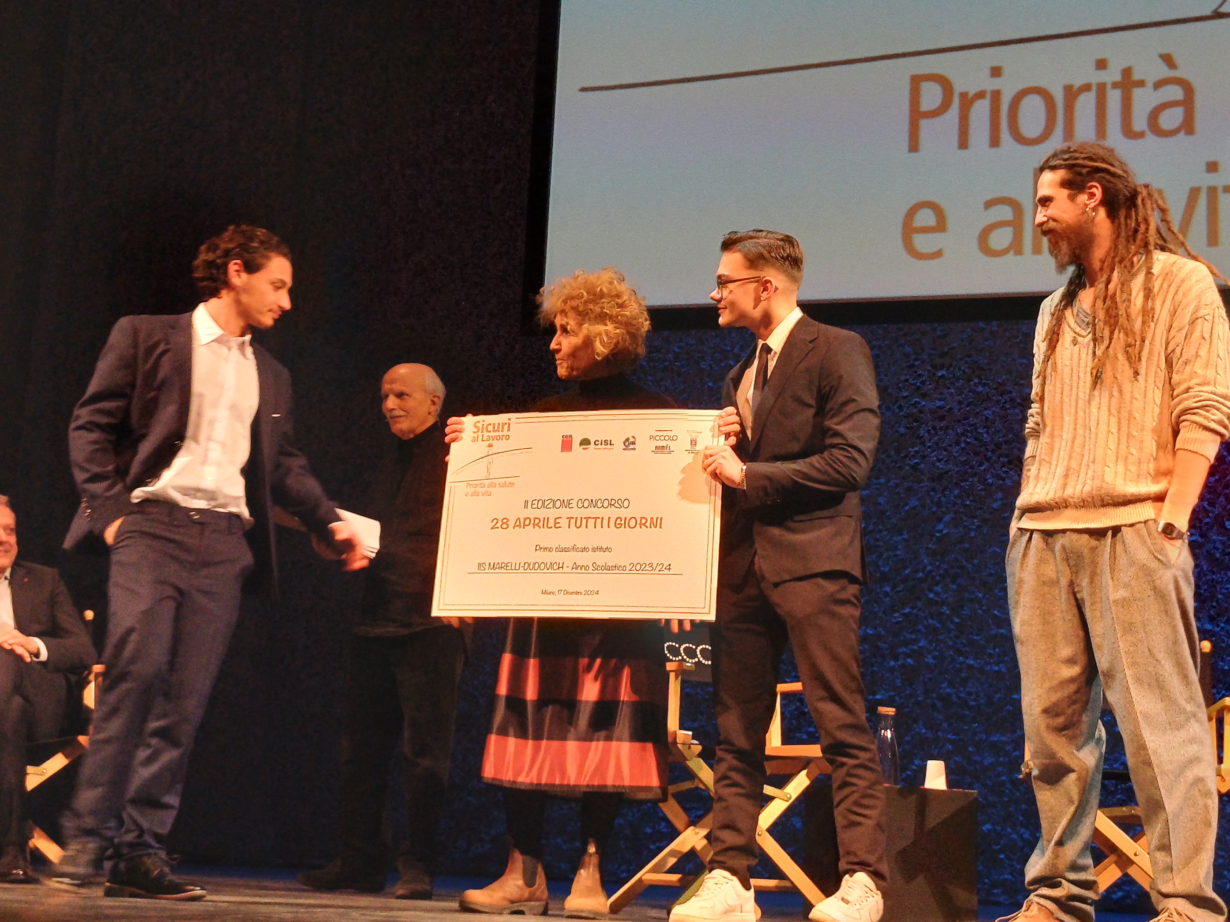 La consigliera delegata alle politiche del lavoro, sociali e alle pari opportunità Diana De Marchi, a nome di Città metropolitana, ha premiato gli studenti dell’IIS Marelli-Dudovich che hanno realizzato il video vincitore del concorso. «Un video molto bello e molto potente sul tema della giornata di oggi, di questo concorso e di questo corso che facciamo nelle scuole superiori come Città metropolitana insieme ai sindacati CGIL, CISL e UIL, sulla tutela e la sicurezza nel lavoro che vede ancora tante vittime nel nostro Paese- ha detto De Marchi – Un tema che ha bisogno di molta consapevolezza e responsabilizzazione e che richiede proprio un accompagnamento costante nella tutela dei diritti delle persone, nel riconoscimento di quei diritti e delle condizioni di un buon lavoro come noi Città metropolitana cerchiamo di fare tutti i giorni. Farlo insieme anche alle scuole significa aumentare la capacità di riconoscere le condizioni di pericolo e quindi avere anche una rete di sostegno per non accettarle ma, anzi, condannarle».