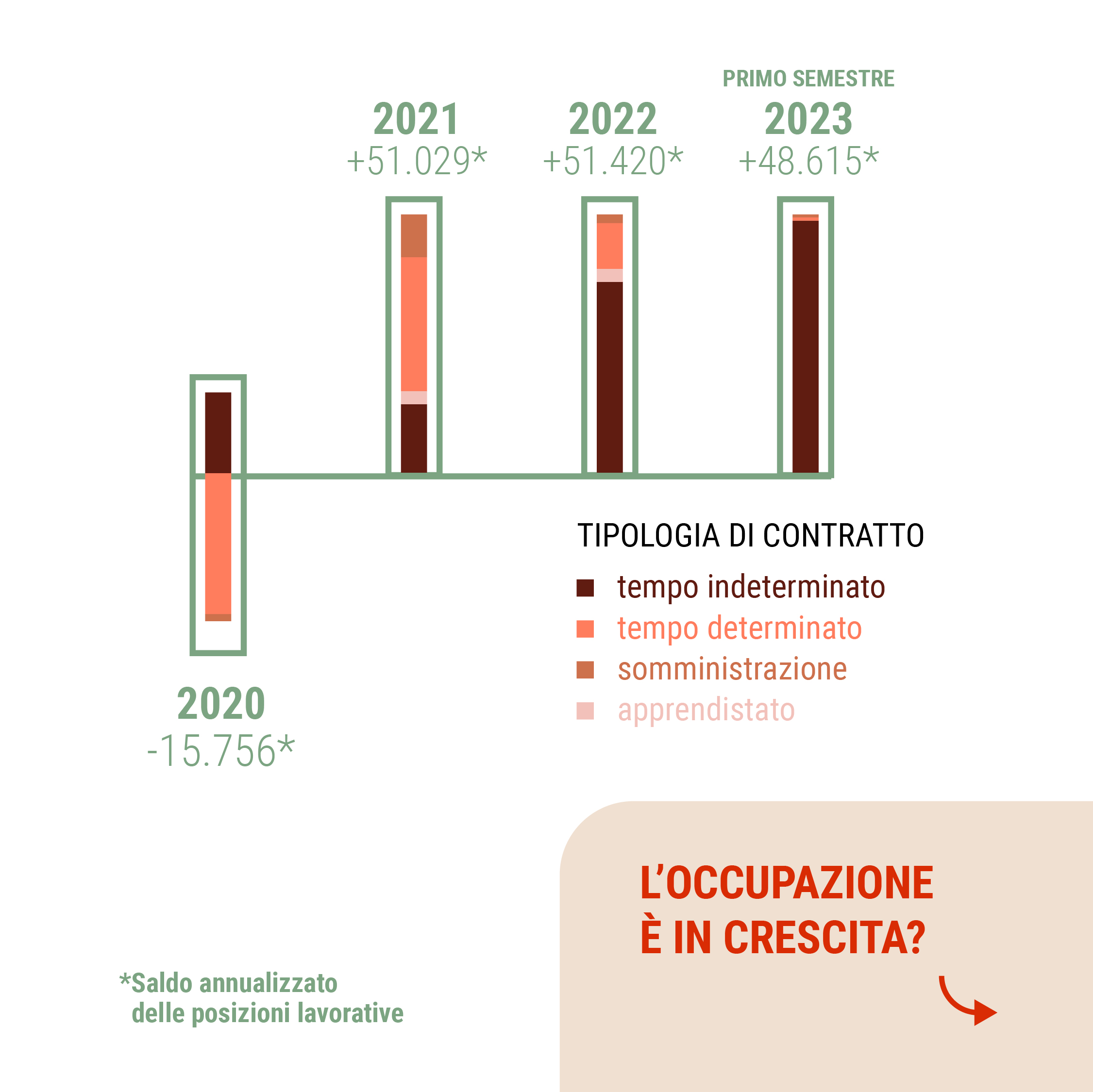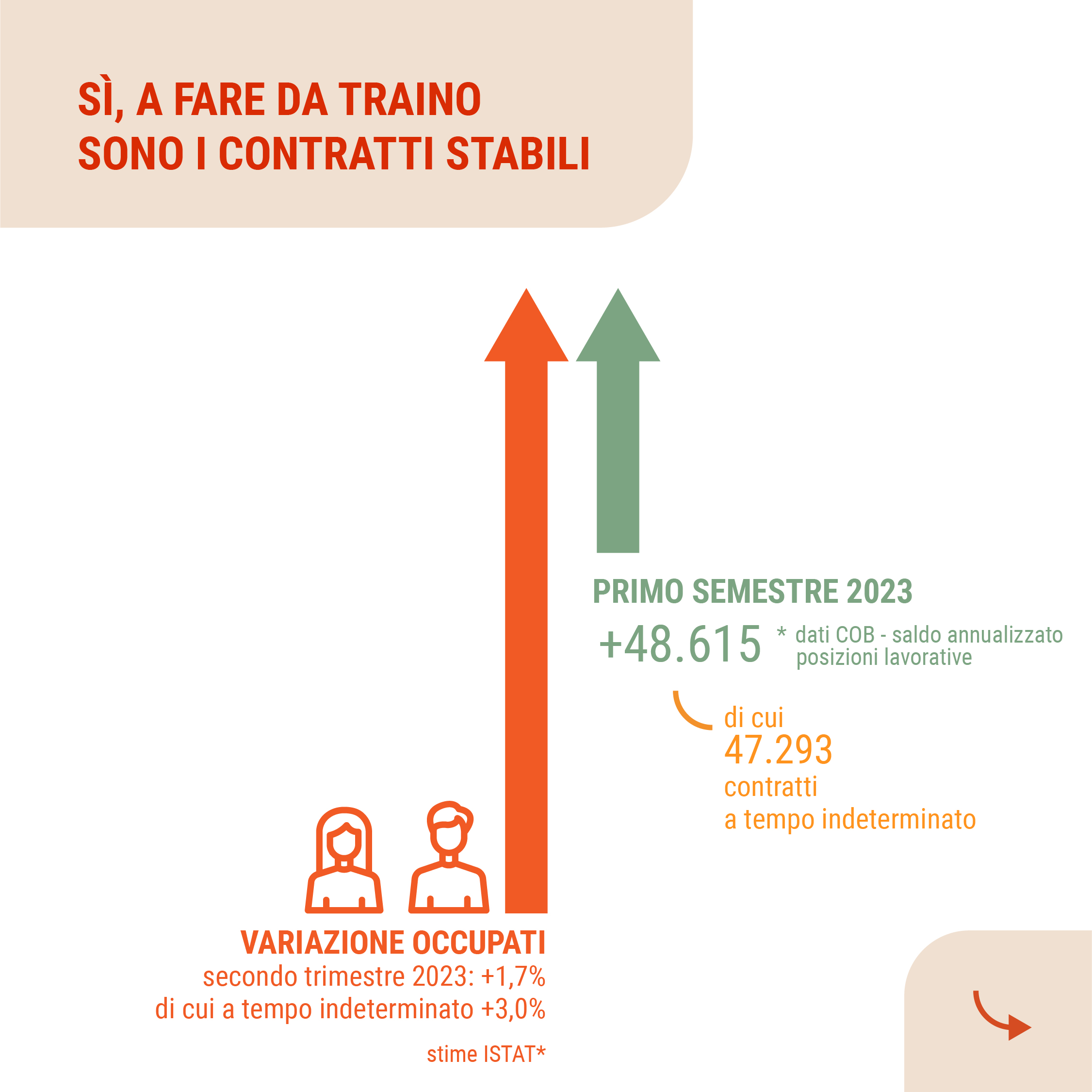 A partire dalla seconda metà del 2022 si assiste ad un rallentamento degli avviamenti al lavoro ma anche delle cessazioni, e un’analoga tendenza per le proroghe e le trasformazioni a tempo indeterminato, che possono essere interpretati come una normalizzazione del mercato dopo lo tsunami della pandemia. Nel primo semestre 2023 si registra un -1,5% per quanto riguarda gli avviamenti al lavoro, e uno -0,9% per le cessazioni. Guardando alle tendenze di fondo, però, si assiste in realtà ad una stabilizzazione dei volumi dei flussi occupazionali e una crescita del numero complessivo degli occupati. Quest’ultimo aspetto è evidenziato dai saldi positivi delle posizioni lavorative: +51.420 nel 2022 e +48.615 nel primo semestre 2023 (vedi tabella 2). Le stime Istat per il primo trimestre del 2023 indicano un tasso di occupazione pari al 64,7%, in aumento di 0,6 punti percentuali rispetto allo stesso periodo dell'anno precedente. Importante il traino dei contratti a tempo indeterminato, sostenuti per lo più dalle stabilizzazioni di impieghi esorditi a termine (+5,3%) o dalla conferma di rapporti di apprendistato. Questo dato si ritrova anche in altre fonti informative, in primo luogo le stime delle forze di lavoro ISTAT che a livello nazionale nel secondo trimestre 2023 evidenziano un’avanzata pari al +1,7% del numero di occupati (+3,0% se si considera la componete a tempo indeterminato). Anche i dati INPS certificano queste dinamiche registrando complessivamente un +2,2% nel primo semestre 2023 rispetto allo stesso periodo dell’anno precedente. Questo aumento suggerisce che le imprese sono disposte a investire sui lavoratori, offrendo loro contratti di lavoro più stabili.