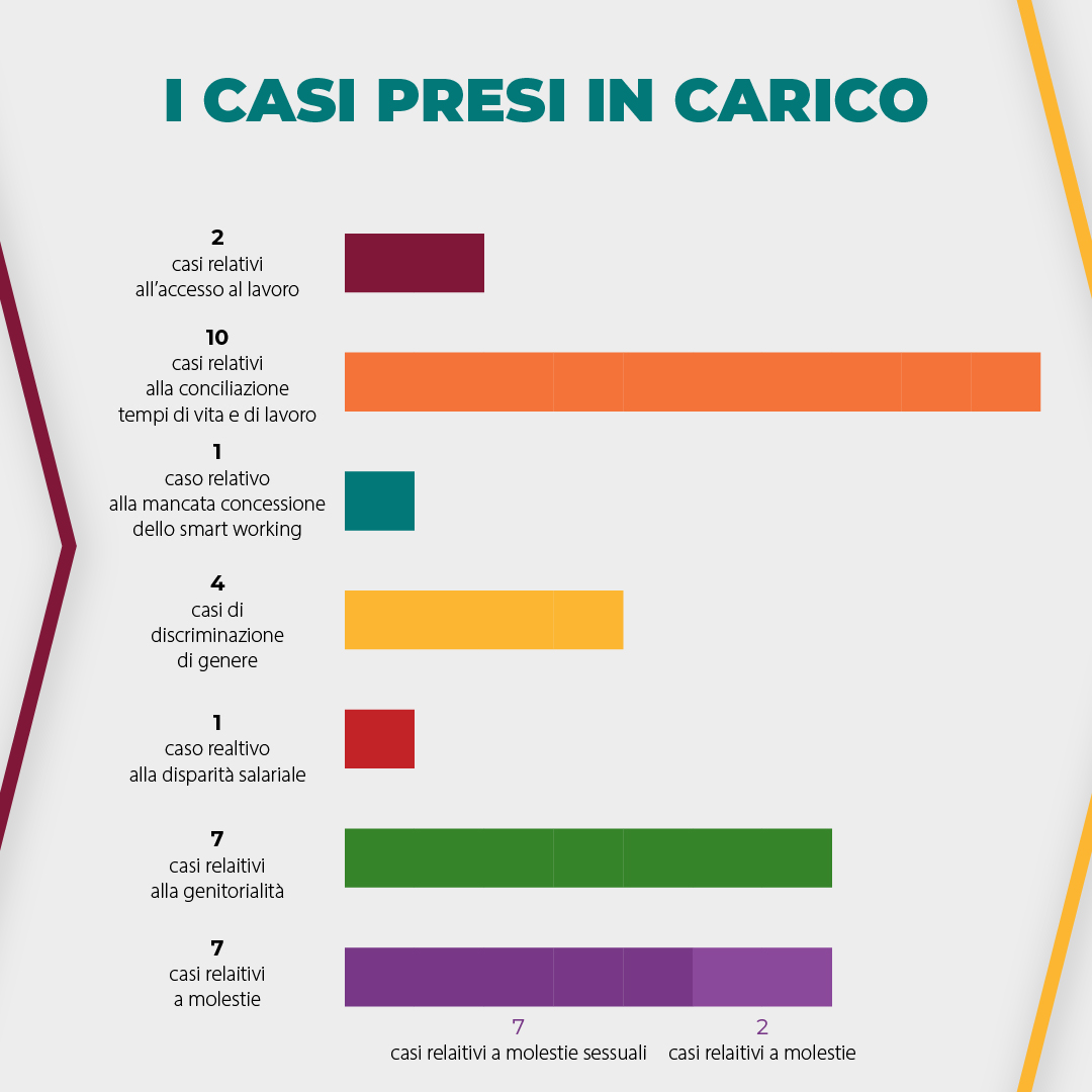 2 sono relativi all’accesso al lavoro, ossia a domande discriminatorie fatte in corso di colloquio (p.e.: ha figli? Vuole avere figli? Ha familiari disabili a carico?);