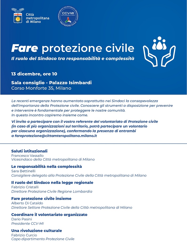 Fare Protezione Civile, Il ruolo del sindaco tra responsabilità e complessità questo il tema di un incontro di formazione promosso da Città metropolitana di Milano in collaborazione con il CCV-MI (Comitato di Coordinamento del Volontariato Organizzato di Protezione Civile della Città metropolitana di Milano) che si è tenuto a Palazzo Isimbardi.
