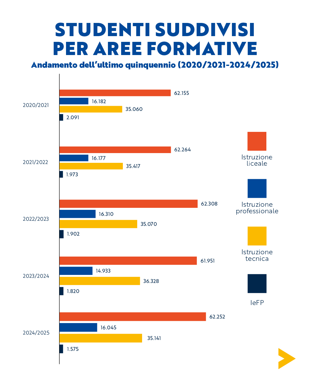 Il 54,14% degli studenti ha scelto un indirizzo liceale, confermando il trend degli ultimi anni. Il liceo scientifico rimane il più richiesto con 27.779 iscritti, sebbene con una lieve flessione del 2,1%. Il liceo delle scienze umane e la sua opzione economico-sociale continuano invece a crescere (+30,7% nel quinquennio, +17,2% rispetto allo scorso anno).