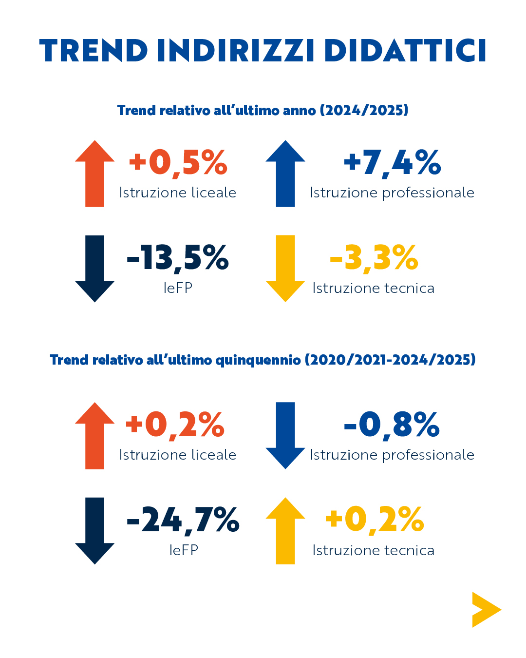 L’istruzione tecnica registra un calo complessivo del -3,3%, con diminuzioni più marcate nei settori Turismo (-5,8%), Meccanica, Meccatronica, Energia (-5,7%), Amministrazione, Finanza e Marketing (-3,9%) e Chimica, Materiali e Biotecnologie (-3,3%). Fanno eccezione i percorsi di Grafica e Comunicazione (+0,6%) e Trasporti e Logistica (+1,8%).
