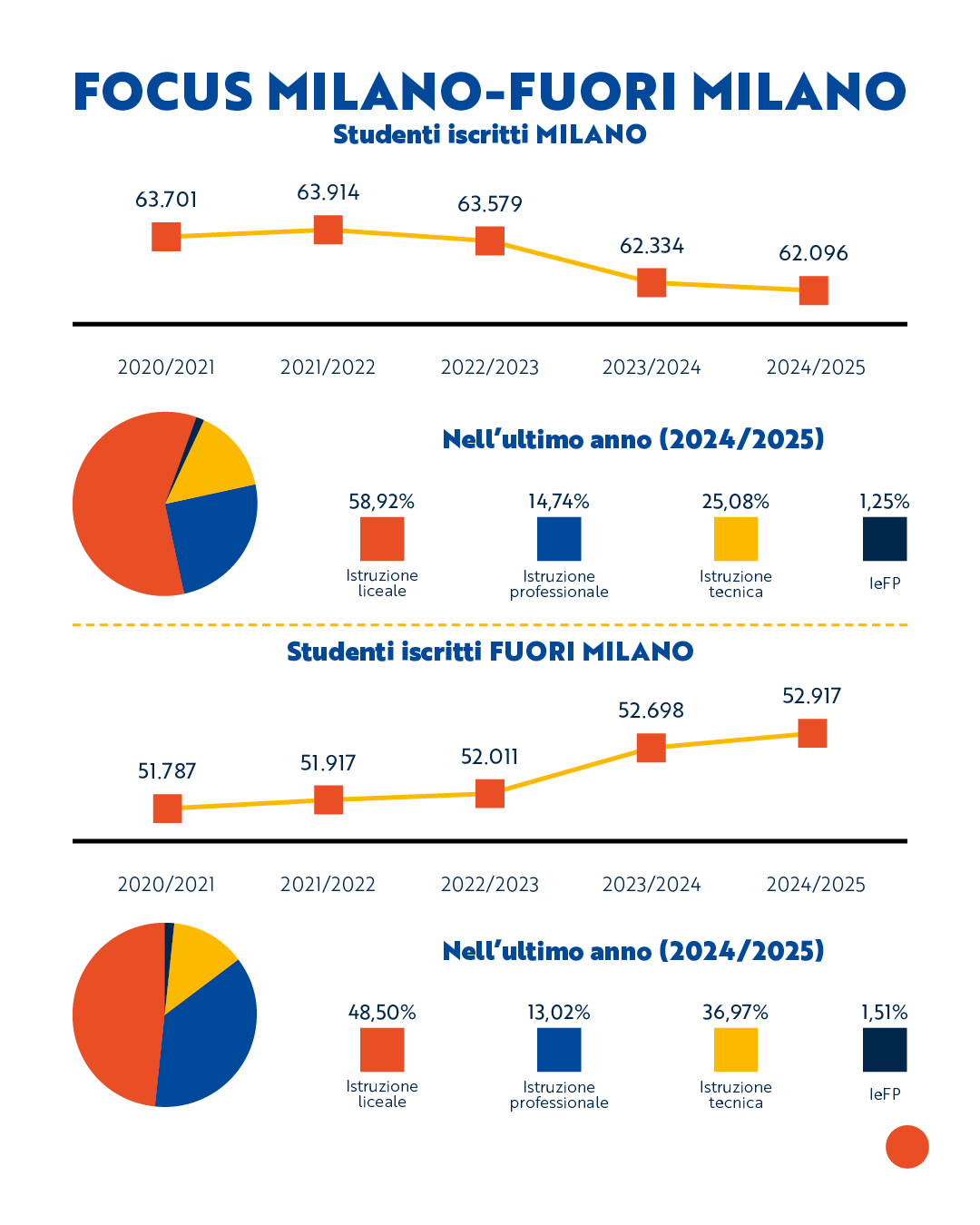 Nella città di Milano gli studenti delle scuole superiori sono 62.096, con una diminuzione del -2,5% nel quinquennio. Tra gli indirizzi, i licei raccolgono la maggioranza delle iscrizioni (58,92%), seguiti dagli istituti tecnici (25,08%) e dai professionali (14,74%).