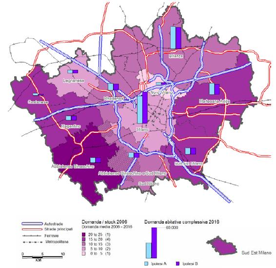 Secondo una valutazione di tre diversi scenari, legati in particolare alle dinamiche dei flussi migratori e al quadro economico provinciale e considerando il fabbisogno già esistente e non soddisfatto a tutto il 2005, la ricerca definisce nell’arco temporale di un decennio, delle ipotesi di fabbisogno abitativo di minima e di massima. Dallo studio emerge una previsione che varia tra le 79 mila e le 140 mila unità abitative necessarie nel territorio della provincia di Milano per soddisfare la domanda complessiva di alloggi. La forbice tra le diverse ipotesi è il frutto delle possibili variabili determinate dalle modalità di evoluzione del sistema economico provinciale, dalle diverse capacità attrattive dei singoli Comuni, dall’intensità e varietà dei flussi migratori interni ed esterni.