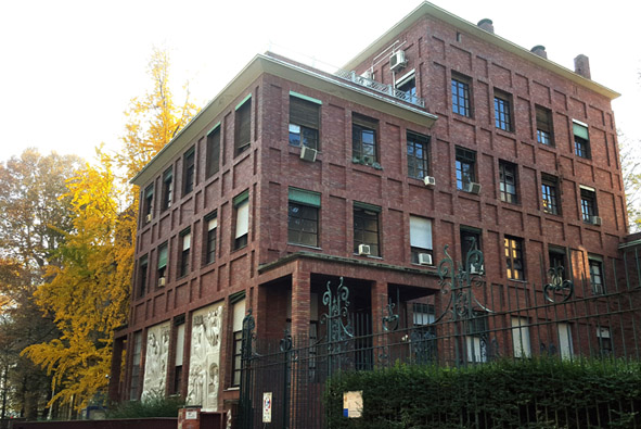 Uscendo dall’Ala Muzio, all’altezza di Via Vivaio 1, possiamo contemplare la facciata dell’edificio di stile funzionalista. Notiamo sopra all’ingresso, costituito da un ampio portale a tre fornici, la torre, richiamo simbolico ad un luogo di potere, che quando fu eretta costituiva una delle più alte costruzioni della zona finale di corso Monforte. Una parte della facciata, ricoperta di marmo grigio per polito, è quella che un tempo era riservata agli amministratori dell’ente mentre tutta la parte ricoperta da mattoncini rossi (si tratta di un mattone sintetico denominato “klinker”, molto amato dall’architetto Giovanni Muzio perché più robusto del normale mattone) era la parte più propriamente riservata agli uffici. Possiamo notare, proprio sopra l’ingresso centrale, “il balcone presidenziale” sovrastato dallo stemma della Provincia nella “versione” risalente al 1927, quindi ancora con lo stemma del Comune di Gallarate, che come abbiamo visto sarà nel 1954 sostituito dall’emblema del comune di Legnano.