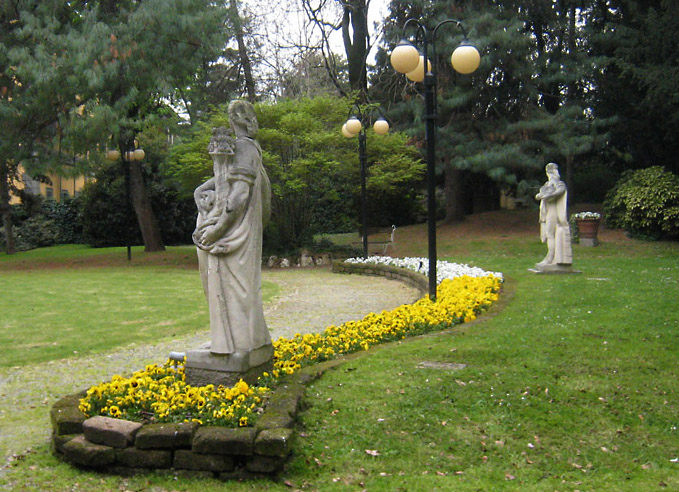 Dalla Sala degli Affreschi si accede al giardino di Palazzo Isimbardi, costruito “all’italiana” con i conti Taverna e trasformato in seguito con i marchesi Isimbardi parzialmente “all’inglese”. Percorrendo i sentieri ghiaiosi incontriamo delle statue del novecento che richiamano alcune attività del territorio: da sinistra verso destra l’industria, l’irrigazione dei campi e l’agricoltura. Possiamo ammirare la facciata del Palazzo verso il giardino, rifatta dall’architetto Tazzini in stile neoclassico. Passeggiando per i vialetti si possono osservare specie floreali che risalgono all’interesse botanico degli Isimbardi nel primo Ottocento: tassi, magnolie sempreverdi e pini azzurri dell’Himalaya, oltre a faggi, ippocastani ed aceri giapponesi. Su un lato del giardino verso via Vivaio, dove ora sorge l’Ala Muzio, proseguiva anticamente il giardino e ancora oggi, in quello che ora è il parcheggio di via Vivaio, troviamo alcune piante: un gigantesco platano di oltre trenta metri ed un albero di origine cinese – un Ginkgo Biloba – che andava di moda nei giardini dell’Ottocento. Verso il muro di confine con Palazzo Diotti (sede della Prefettura e anch’esso di proprietà della Provincia di Milano) si erge la collinetta un tempo collegata da un ponticello al giardino confinante. Proprio lungo questo muro di confine due solide porte – oggi ben chiuse – consentono il passaggio fra il palazzo della Prefettura e quello della Provincia. Si racconta che il dittatore Benito Mussolini utilizzasse tali vie nascoste per concedersi brevi evasioni nei dintorni senza essere notato dal personale del palazzo governativo passando dal giardino provinciale. Sembra accertato che il convoglio con Mussolini in fuga da Milano – il 25 aprile 1945 – si mosse da Palazzo Isimbardi e fu dunque dal portone di via Vivaio, 3 che l’ex duce uscì andando incontro al suo fatale destino. Dal giardino è anche visibile la cosiddetta “torre delle sirene”, situata in un cortile tra il palazzo della Provincia e quello della Prefettura. Questa torre – reperto dell’architettura bellica della seconda guerra mondiale – doveva segnalare, appunto con l’uso delle sirene, un’incursione aerea e servire quindi da rifugio alle autorità governative dell’epoca