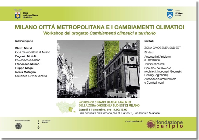Lunedì 11 dicembre ore 14,00/16.00 sala consigliare del Comune, via C.Battisti,2 - San Donato Milanese Workshop 3 "Piano di adattamento della zona omogenea SUD-EST Milano.