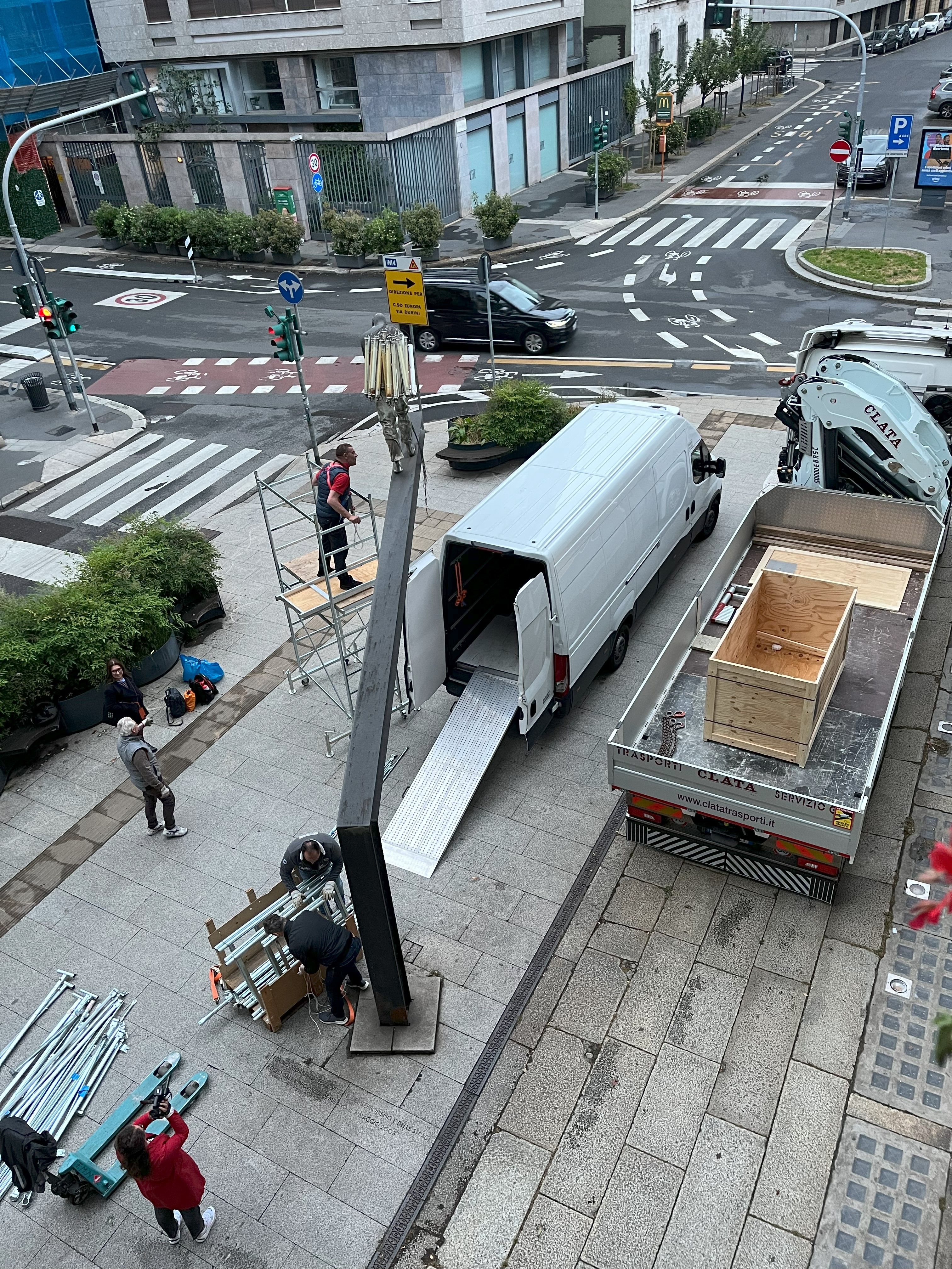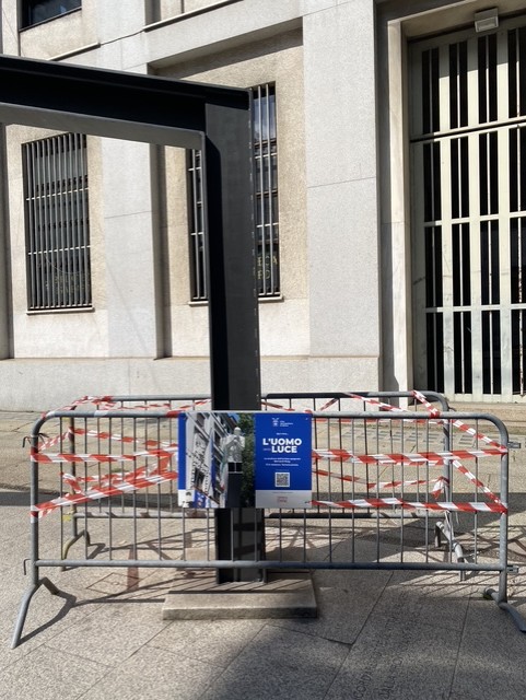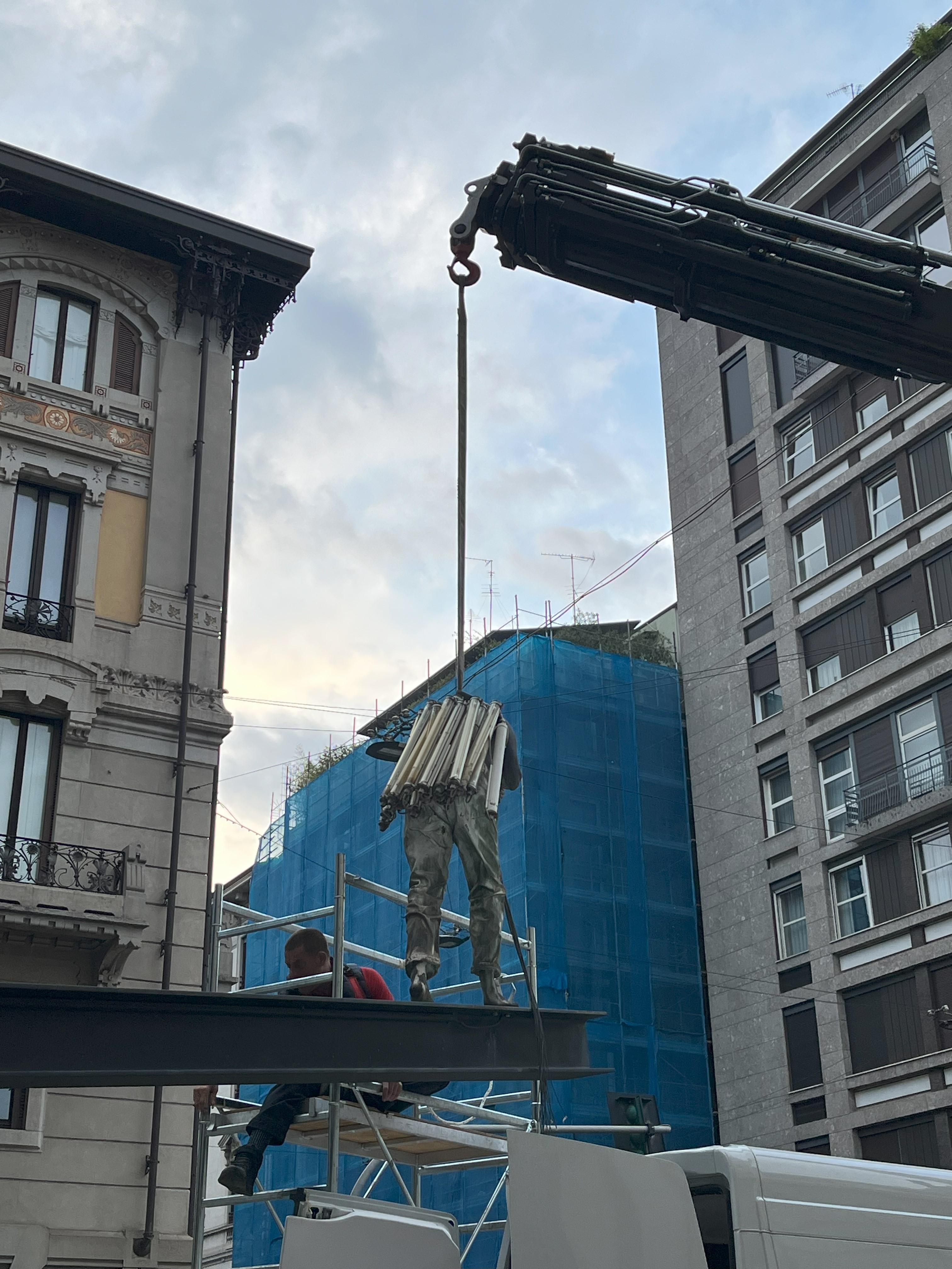 All'alba di lunedì 5 maggio la scultura"L'Umo della luce" è stata sganciata dal suo supporto davanti alla sede della Città metropolitana di Milano per iniziare un percorso di restauro in laboratorio.