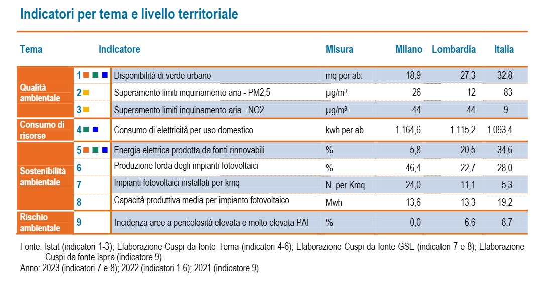 La disponibilità di verde urbano nel milanese è inferiore rispetto al resto del Paese, con 18,9 mq per abitante rispetto ai 32,8 mq del dato nazionale (con una differenza del 42,2%). Questo dato essenziale per la qualità della vita dei cittadini si è mantenuto costante, con un leggero aumento negli ultimi sei anni anche se il “gap” con l’Italia è pressoché invariato. Sempre preoccupanti, in questo contesto, le risultanze sull’inquinamento dell’aria che si evidenziano sia con la concentrazione media annua di PM2,5, particelle microscopiche altamente nocive per la salute presenti nell'aria e dovute a processi inquinanti che nel 2022 ha raggiunto il valore di 26 μg/m3 (il limite per la salute è di 10 μg/m3), sia con la concentrazione media annua di biossido d’azoto (NO2), principale inquinante dei processi di combustione, che ha raggiunto il valore di 44 μg/m3 (il limite per la salute è di 40 μg/m3). [...]