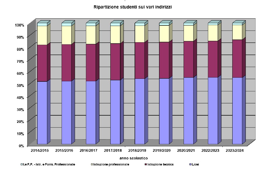 Nel grafico consultabile che riporta gli ultimi nove anni scolastici, evidenzia, per concludere, una certa stabilità nella ripartizione studentesca tra i vari indirizzi di studio.