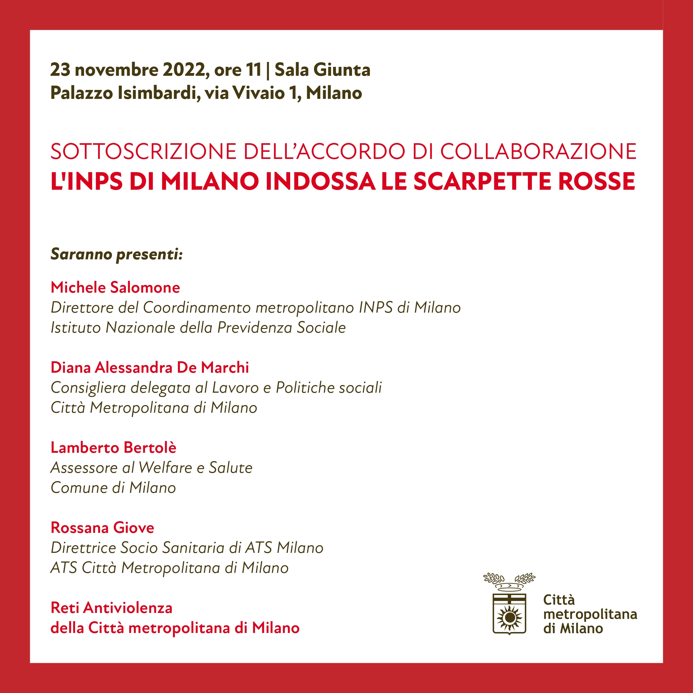 Mercoledì 23 novembre 2022 alle ore 11 in Sala Giunta a Palazzo Isimbardi (via Vivaio 1, Milano) si terrà la sottoscrizione formale dell'accordo di collaborazione tra INPS Milano, Città Metropolitana, Comune di Milano e Rete Antiviolenza Milano con l'obiettivo di dare avvio allo sportello telematico di orientamento, informazione, consulenza ed accompagnamento per le donne vittime di violenza.