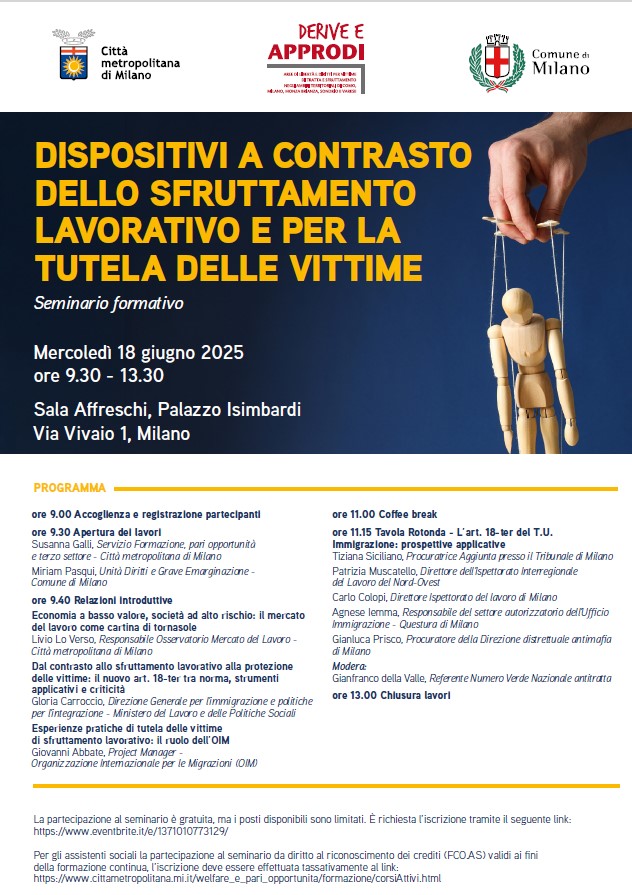 La Città metropolitana di Milano, in collaborazione con il Comune di Milano, organizza, nell'ambito del progetto Derive e approdi, per mercoledì 18 giugno 2025, dalle 9.30 alle 13.30, un seminario formativo dal titolo: “Dispositivi a contrasto dello sfruttamento lavorativo e per la tutela delle vittime”.