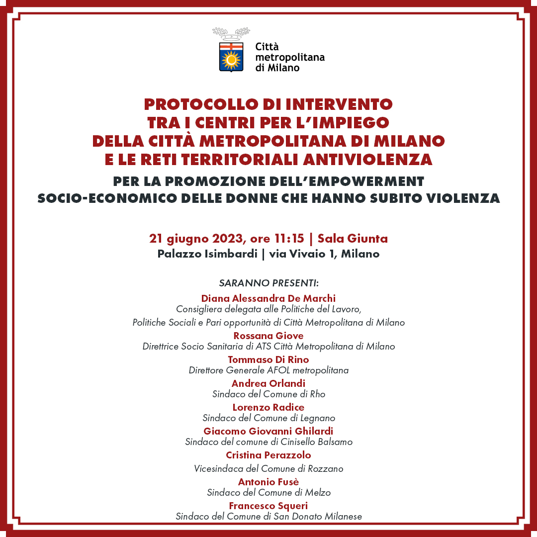 Il 21 giugno a Palazzo Isimbardi (via Vivaio 1, Milano) alle 11:15 la Città metropolitana Milano e le Reti territoriali antiviolenza sigleranno un Protocollo di intervento per la promozione dell'empowerment socio economico delle donne che hanno subito violenza. Il programma dettagliato dell'evento: