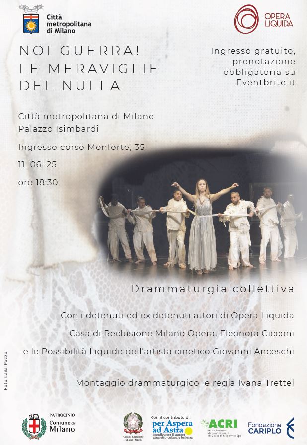 L’11 giugno, nella splendida cornice di Palazzo Isimbardi (ingresso da corso Monforte 35, Milano), la compagnia Opera Liquida mette in scena il suo lavoro più visionario: Noi guerra! Le meraviglie del nulla. Lo spettacolo – a ingresso gratuito con prenotazione obbligatoria qui – inizierà alle 18.30 e trasformerà il cortile storico della sede della Città metropolitana di Milano in un’arena teatrale carica di emozione e riflessione.
